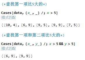 Cases[data, {x_, _} /; x > 5]这句话就表示第一个x大于5,第二个元素任意