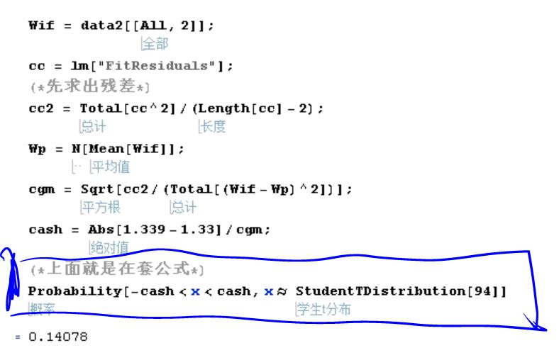 Wif = data2[[All, 2]]; cc = lm["FitResiduals"]; (*先求出残差*) cc2 = Total[cc^2]/(Length[cc] - 2); Wp = N[Mean[Wif]]; cgm = Sqrt[cc2/(Total[(Wif - Wp)^2])]; cash = Abs[1.339 - 1.33]/cgm; (*上面就是在套公式*) Probability[-cash < x < cash,x \[Distributed] StudentTDistribution[94]]