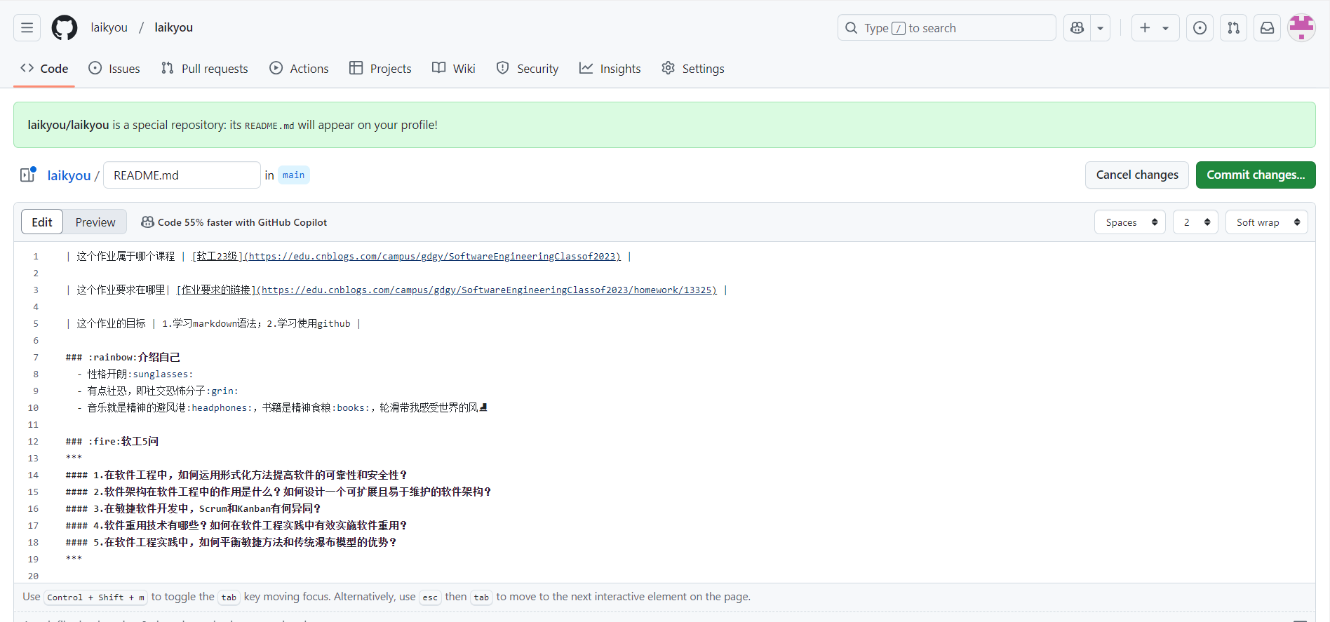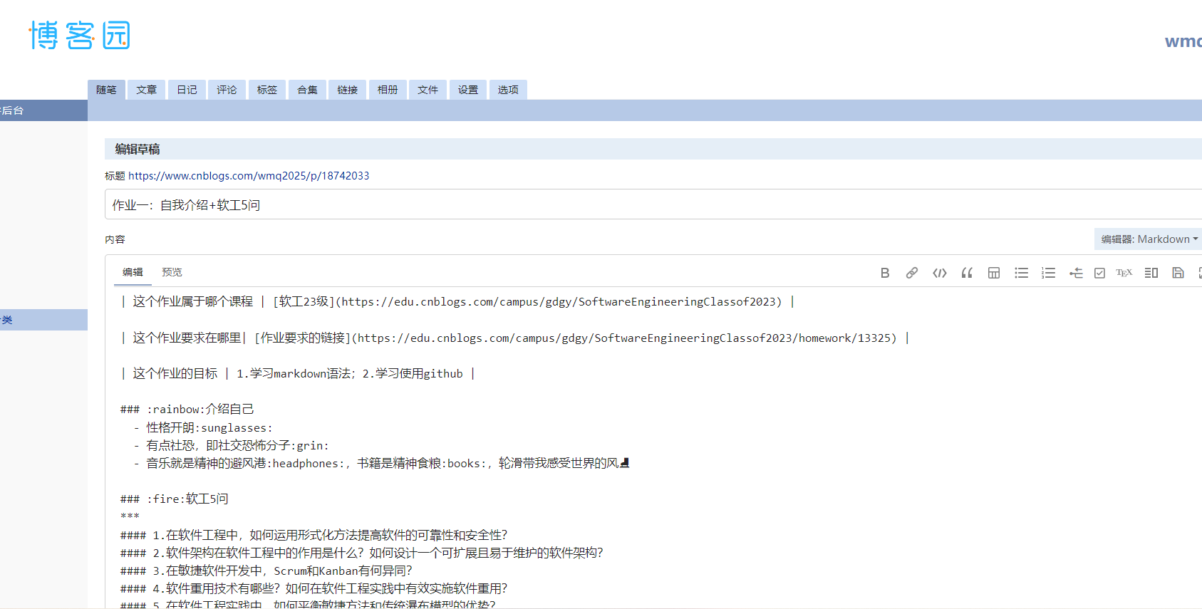 | 这个作业的目标 | 1.学习markdown语法;2.学习使用github |