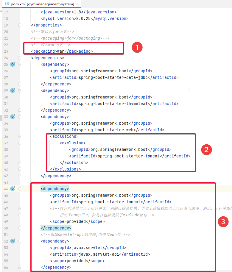 <?xml version="1.0" encoding="UTF-8"?> <project xmlns="http://maven.apache.org/POM/4.0.0" xmlns:xsi="http://www.w3.org/2001/XMLSchema-instance" xsi:schemaLocation="http://maven.apache.org/POM/4.0.0 https://maven.apache.org/xsd/maven-4.0.0.xsd"> <modelVersion>4.0.0</modelVersion> <parent> <groupId>org.springframework.boot</groupId> <artifactId>spring-boot-starter-parent</artifactId> <version>2.5.3</version> <relativePath/> <!-- lookup parent from repository --> </parent> <groupId>com.milotnt</groupId> <artifactId>gym-management-system</artifactId> <version>0.0.1-SNAPSHOT</version> <name>gym-management-system</name> <description>gym-management-system</description> <properties> <java.version>1.8</java.version> <mysql.version>8.0.25</mysql.version> </properties> <!--默认为jar方式--> <!--<packaging>jar</packaging>--> <!--改为war方式--> <packaging>war</packaging> <dependencies> <dependency> <groupId>org.springframework.boot</groupId> <artifactId>spring-boot-starter-data-jdbc</artifactId> </dependency> <dependency> <groupId>org.springframework.boot</groupId> <artifactId>spring-boot-starter-thymeleaf</artifactId> </dependency> <dependency> <groupId>org.springframework.boot</groupId> <artifactId>spring-boot-starter-web</artifactId> <exclusions> <exclusion> <groupId>org.springframework.boot</groupId> <artifactId>spring-boot-starter-tomcat</artifactId> </exclusion> </exclusions> </dependency> <dependency> <groupId>org.springframework.boot</groupId> <artifactId>spring-boot-starter-tomcat</artifactId> <!--打包的时候可以不用包进去,别的设施会提供。事实上该依赖理论上可以参与编译,测试,运行等周期。 相当于compile,但是打包阶段做了exclude操作--> <scope>provided</scope> </dependency> <!--添加servlet-api的依赖,用来打war包 --> <dependency> <groupId>javax.servlet</groupId> <artifactId>javax.servlet-api</artifactId> <scope>provided</scope> </dependency> <dependency> <groupId>org.springframework.boot</groupId> <artifactId>spring-boot-devtools</artifactId> <optional>true</optional> </dependency> <dependency> <groupId>org.mybatis.spring.boot</groupId> <artifactId>mybatis-spring-boot-starter</artifactId> <version>2.2.0</version> </dependency> <dependency> <groupId>mysql</groupId> <artifactId>mysql-connector-java</artifactId> <scope>runtime</scope> </dependency> <dependency> <groupId>org.springframework.boot</groupId> <artifactId>spring-boot-starter-test</artifactId> <scope>test</scope> </dependency> </dependencies> <build> <finalName>chuangxing</finalName> <plugins> <plugin> <groupId>org.springframework.boot</groupId> <artifactId>spring-boot-maven-plugin</artifactId> </plugin> </plugins> </build> </project>