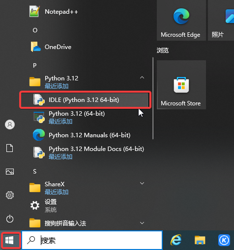 6、可以使用自带的IDLE编辑器开发,点击电脑开始键找到如下圈红处点击打开