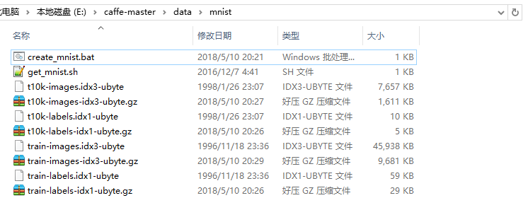 第一步: 官网下载mnist数据 http://yann.lecun.com/exdb/mnist/,共4个文件,解压放到caffe-master\data\mnist下