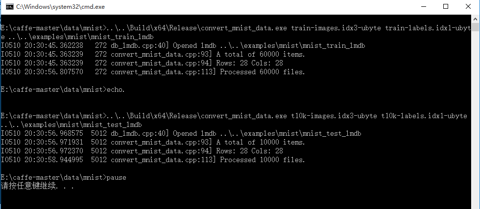 (PS:想转换成LEVELDB格式的话,只需要在.bat文件中把 mnist_train_lmdb改成mnist_train_leveldb ,有两处喔! )