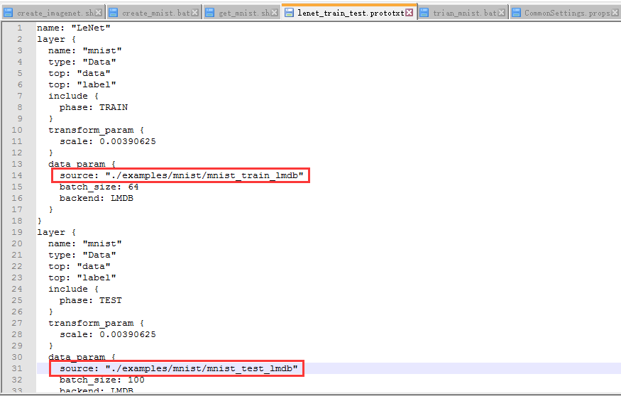 source: "../../examples/mnist/mnist_train_lmdb" batch_size: 64 backend: LMDB source:"../../examples/mnist/mnist_test_lmdb" batch_size: 100 backend: LMDB