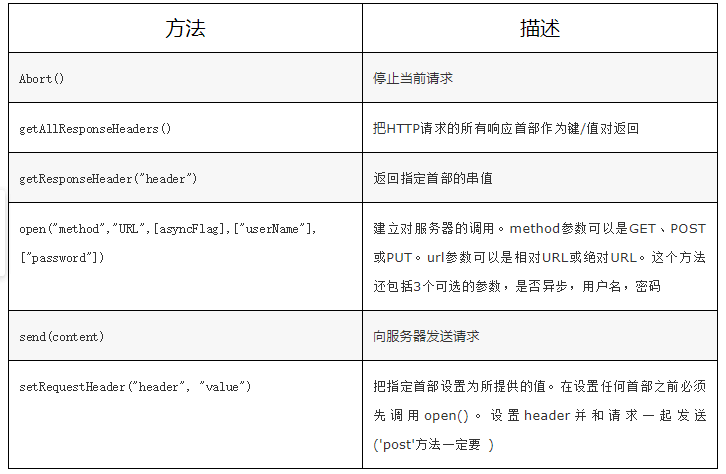 Ajax的核心是XMLHttpRequest对象,这是一个Javascript对象。下面是XMLHttpRequest对象的一些方法描述:
