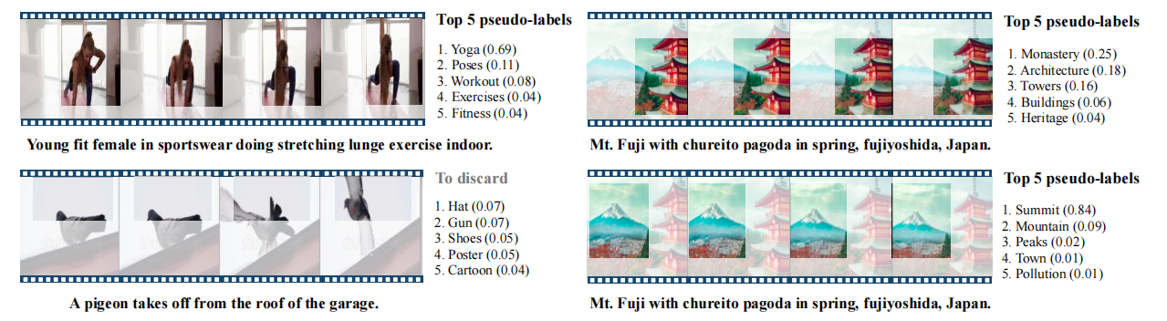 提示器生成的伪标签示例(括号中的分数)。突出显示的区域被输入提示器。我们的方法生成了一系列常见的实体类别,这些类别通常不被对象检测器覆盖,例如塔、顶峰、瑜伽。此外,实体标签并不总是出现在文本描述中,作为语料库级监督的来源。左下角:不包含实体的随机裁剪。提示器由此产生具有低相似度的伪标签。在预训练期间,如果伪标签的最可能实体的分数小于0.2,则丢弃伪标签。对:从同一视频中为不同作物生成的标签。