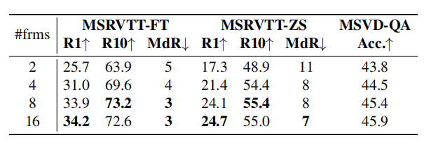 帧数对MSRVTT文本视频检索和MSVD-QA的影响。更多的帧通常导致更好的性能,8-16帧在度量和计算开销之间实现了良好的折衷。