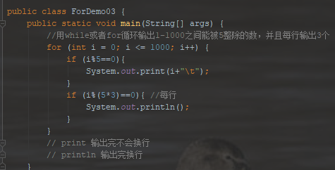 使用for循环输出1-1000能被5整除的数,且每行3个