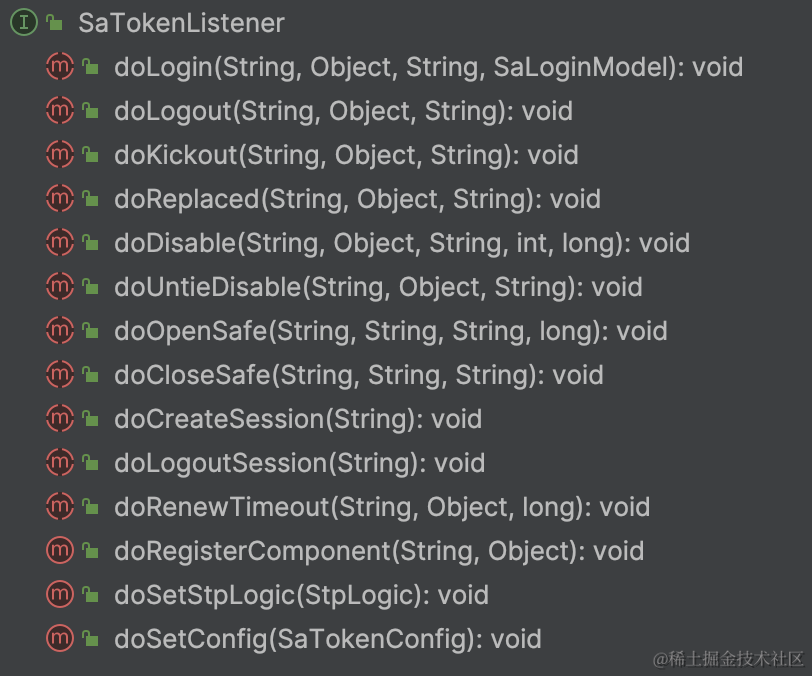 SaTokenEventCenter从命名就可以知道这是satoken的事件发布中心类。主要属性就是List<SaTokenListener> listenerList,也就是所有侦听器,其方法主要分为两类:一类是管理侦听器,另一类就是事件发布,而且所有方法都是静态方法。