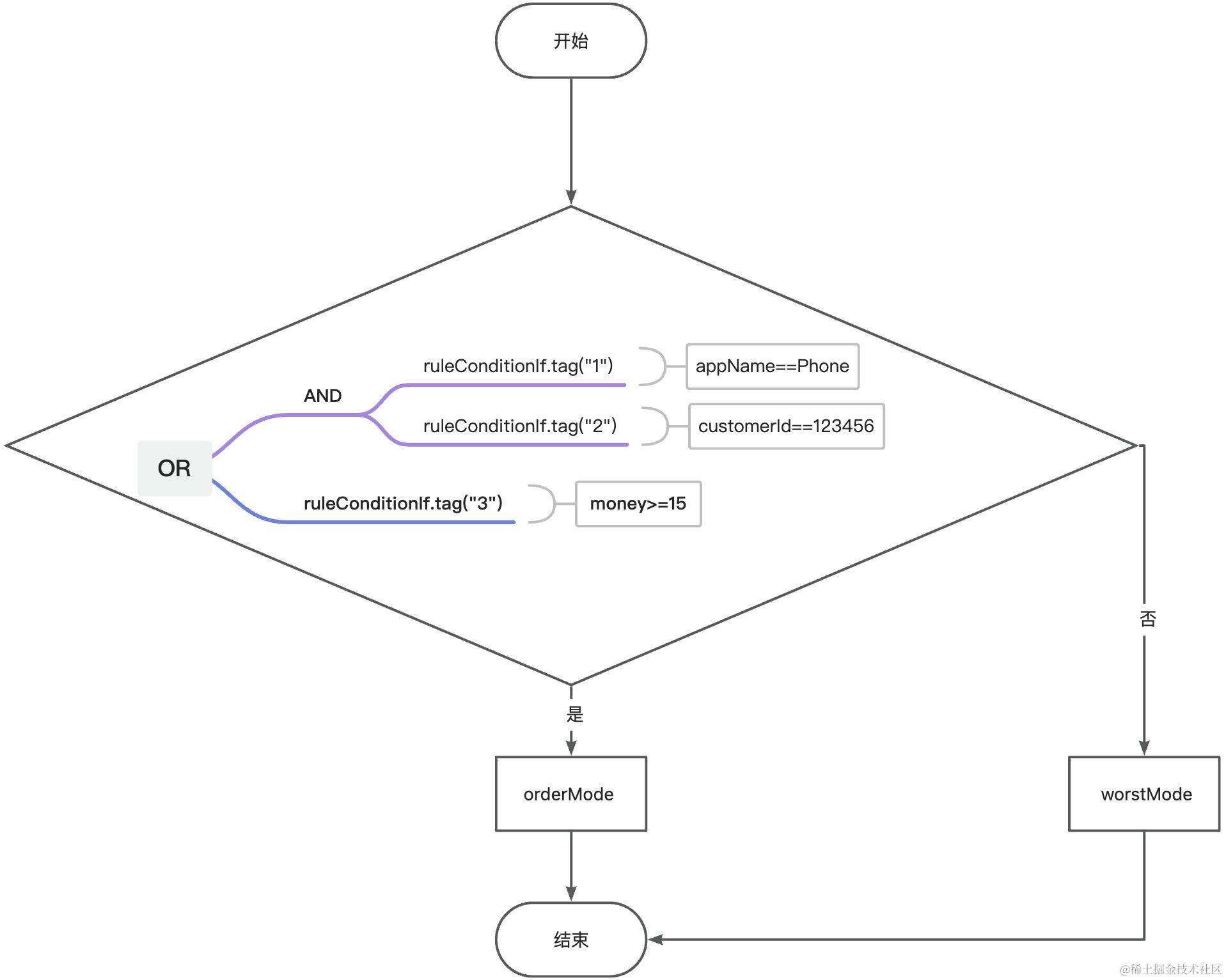 IF(OR(AND(ruleConditionIf.tag("1"),ruleConditionIf.tag("2")),ruleConditionIf.tag("3")),orderMode,worstMode);,ruleConditionIf为上面的规则条件组件。