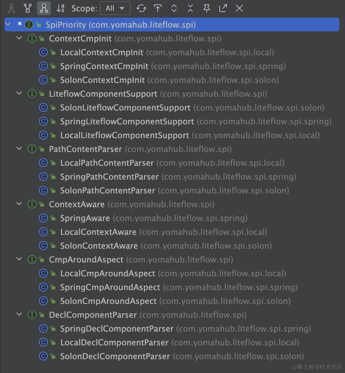 其中SpiPriority为基础接口,通过mac快捷键control + H(windows为ctrl + H)查看其继承树,发现最终归结于三个类,LocalXXX、SpringXXX、SolonXXX,他们就是LiteFlow针对不同环境的SPI实现类。