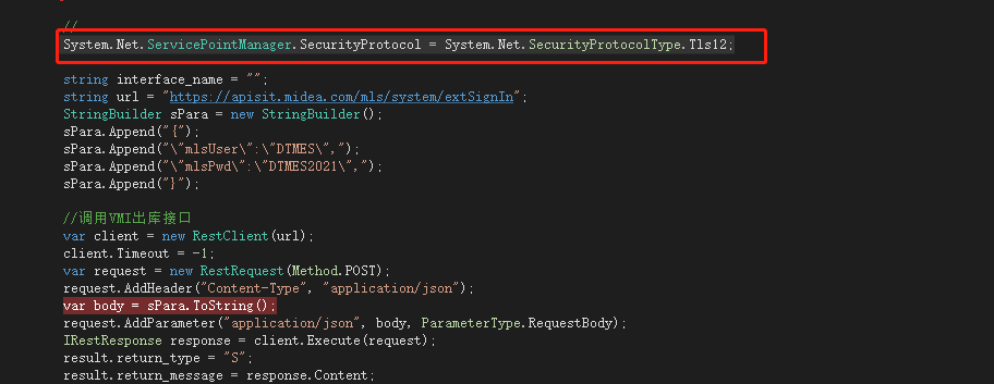 添加代码 System.Net.ServicePointManager.SecurityProtocol = System.Net.SecurityProtocolType.Tls12;