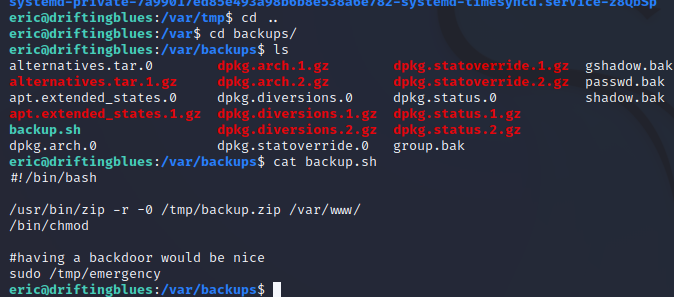 继续查看一下备份文件backup.sh 发现sudo执行/tmp/emergency文件 但是/tmp 下面没有 需要创建 并将eric用户加入sudo组
