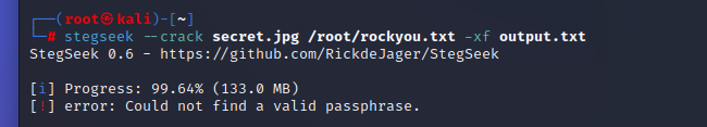 stegseek --crack secret.jpg /root/rockyou.txt -xf output.txt