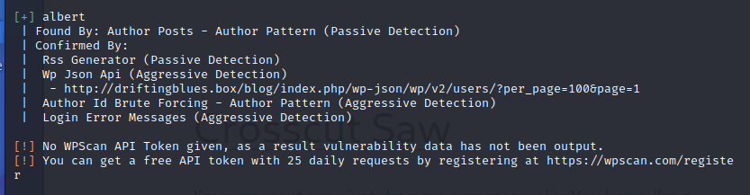 3:用wpscan探测他的用户名,发现一个albert用户名