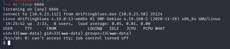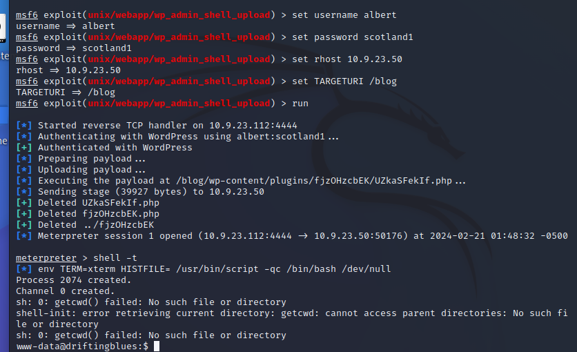 wpscan --url http://driftingblues.box/blog -U user.txt -P /usr/share/wordlists/rockyou.txt