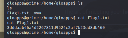 升级下shell:python -c 'import pty;pty.spawn("/bin/bash")';,然后在/home/qloapps目录下发现Flag1.txt文件,访问该文件,成功获得flag值。