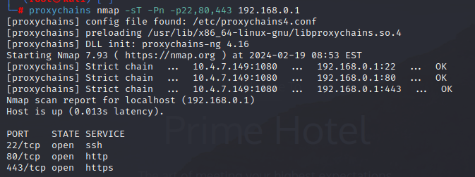 proxychains nmap -sT -Pn -p22,80,443 192.168.0.1