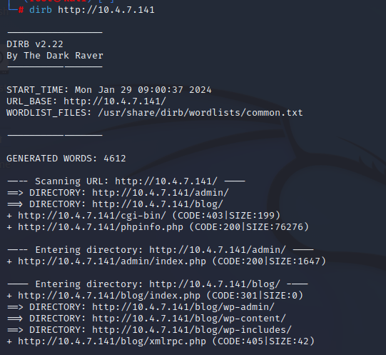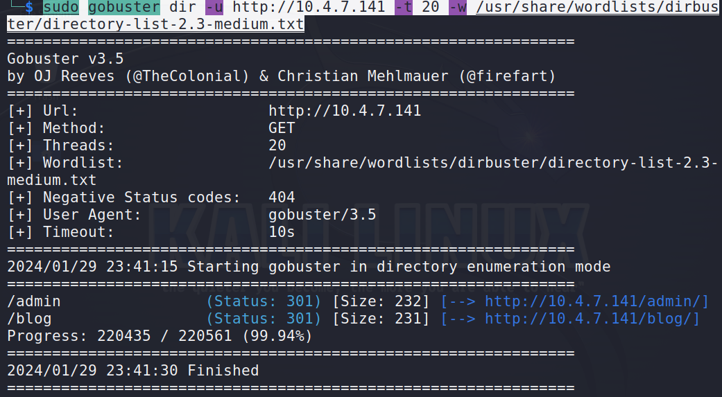 sudo gobuster dir -u http://10.4.7.141 -t 20 -w /usr/share/wordlists/dirbuster/directory-list-2.3-medium.txt | grep ""