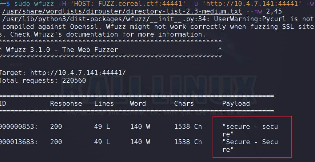 sudo wfuzz -H 'HOST: FUZZ.cereal.ctf:44441' -u 'http://10.4.7.141:44441' -w /usr/share/wordlists/dirbuster/directory-list-2.3-medium.txt --hw 2,45