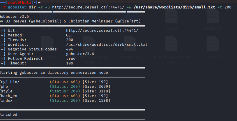 gobuster dir -r -u http://secure.cereal.ctf:44441/back_en -w /usr/share/wordlists/dirb/small.txt -t 200