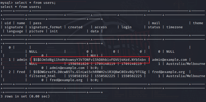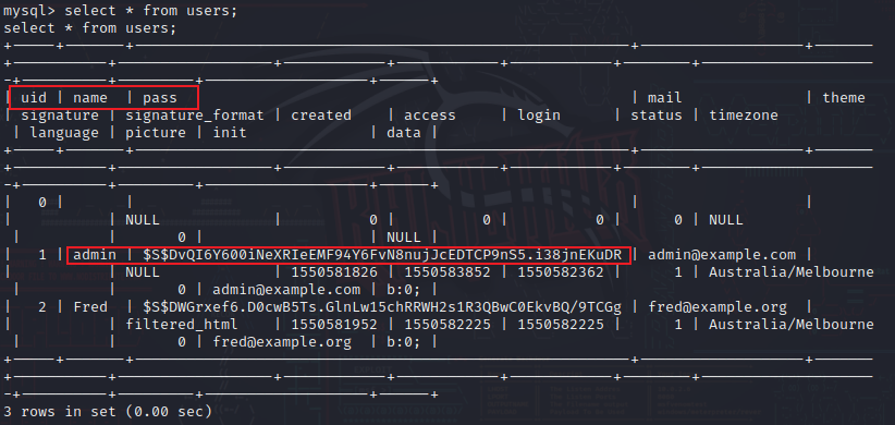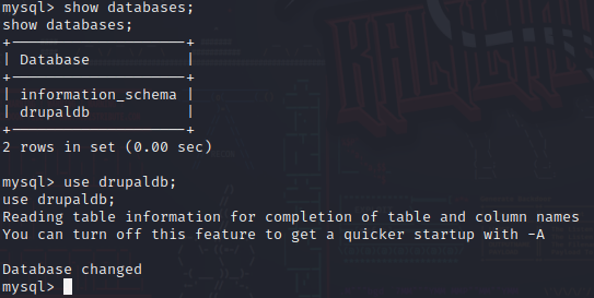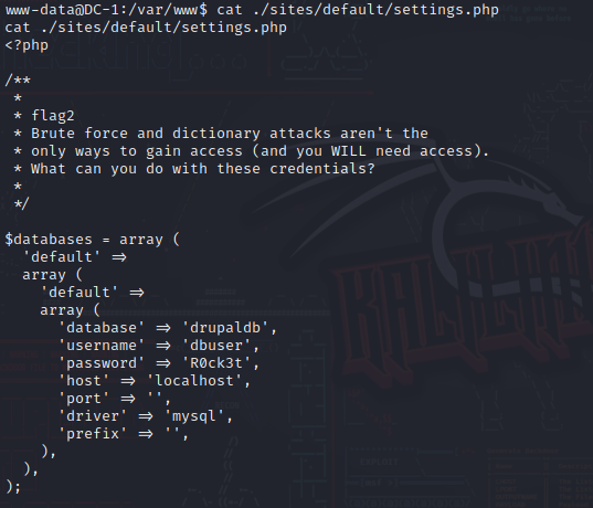 看到了flag2文件,Flag2中提示我们暴力破解不可取并且需要提权。还有一个名为drupaldb的数据库,然后我们登录一下这个数据库,查看其中的内容。
