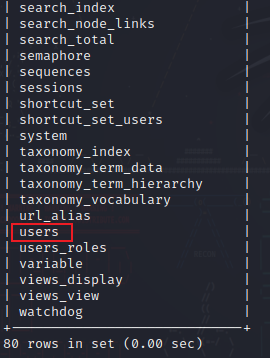 可以看到有一个users的表,估计就是存储网站注册用户的信息的表。