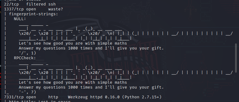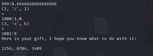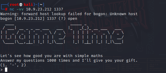 此端口运行的是telnet服务,用nc连接了一下,得到提示,连续正确回答问题1000次,会得到一个礼物。