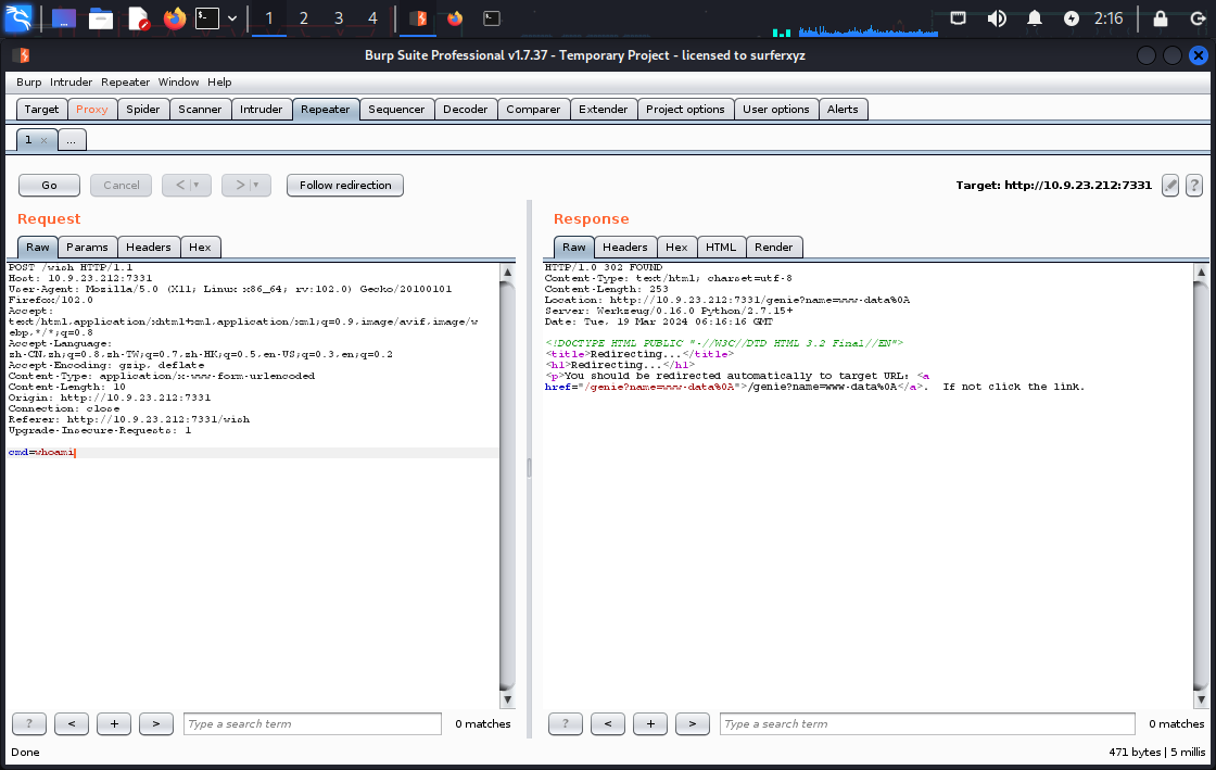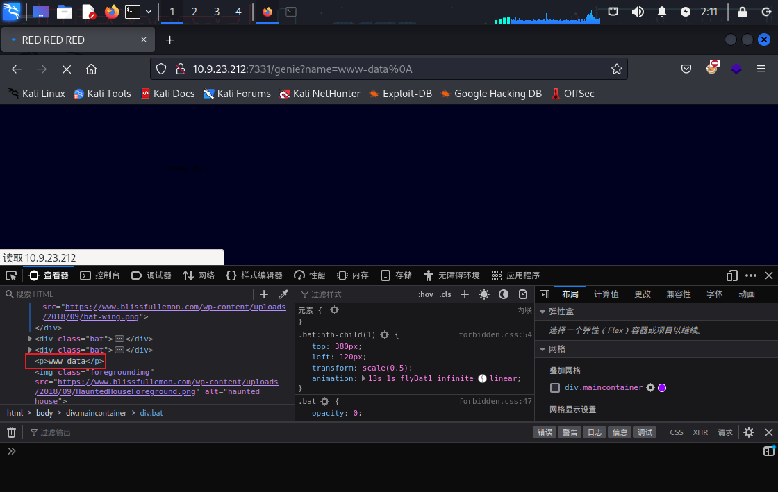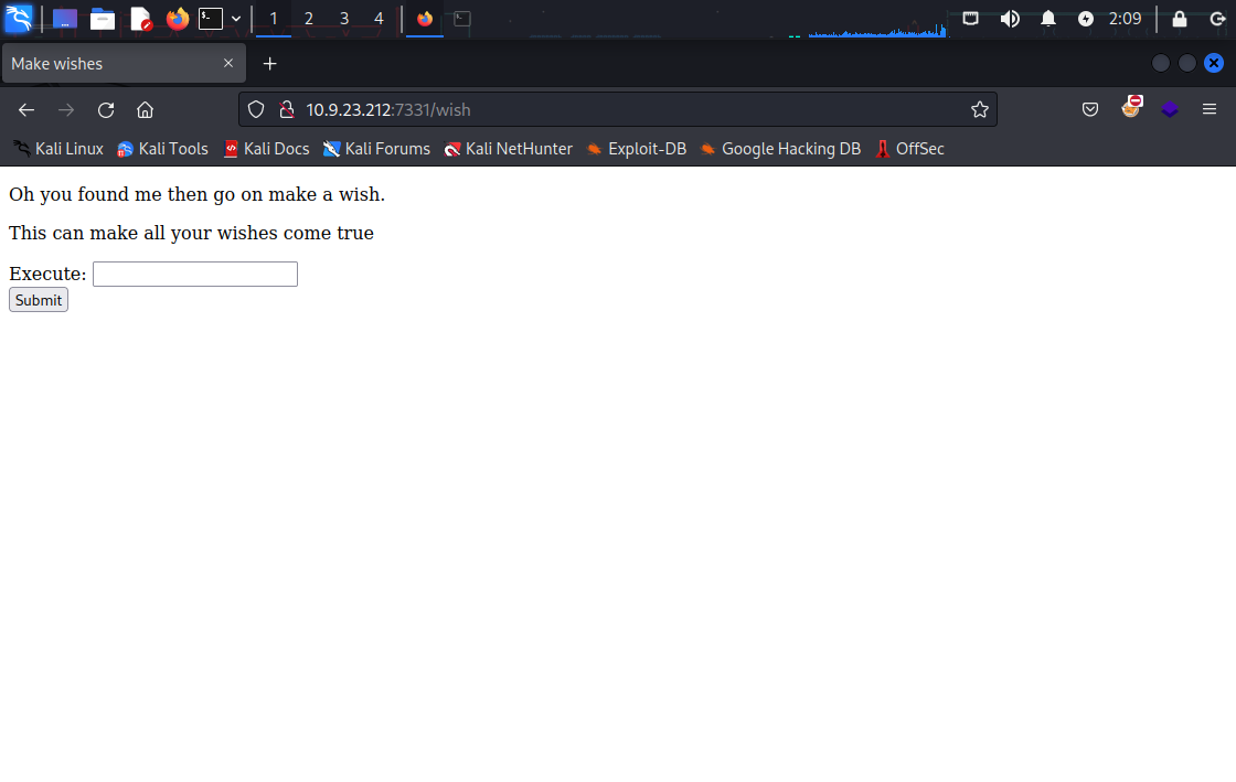 访问/wish目录,看起来像是命令执行,测试一下,一旦执行下面的命令,页面会跳转,并通过审查元素可以定位出命令执行结果