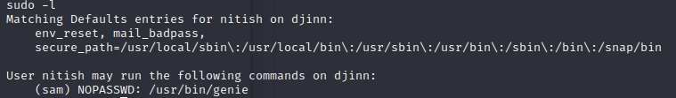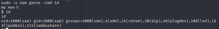 这里genie命令可以使用sam的身份进行运行,而且无需passwd