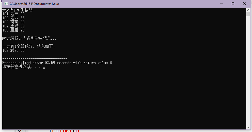printf("\n一共有%d个最低分,信息如下:\n", count);