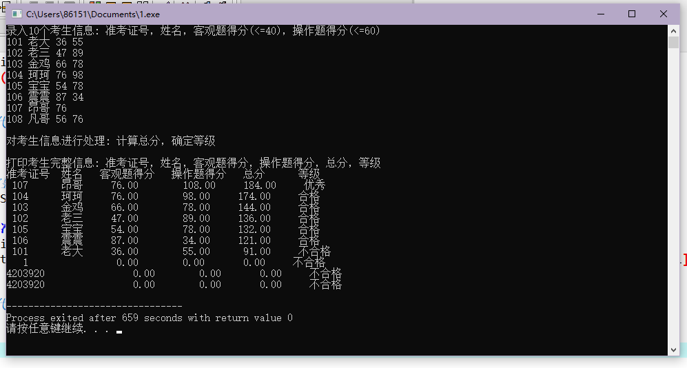 printf("\n打印考生完整信息: 准考证号,姓名,客观题得分,操作题得分,总分,等级\n");