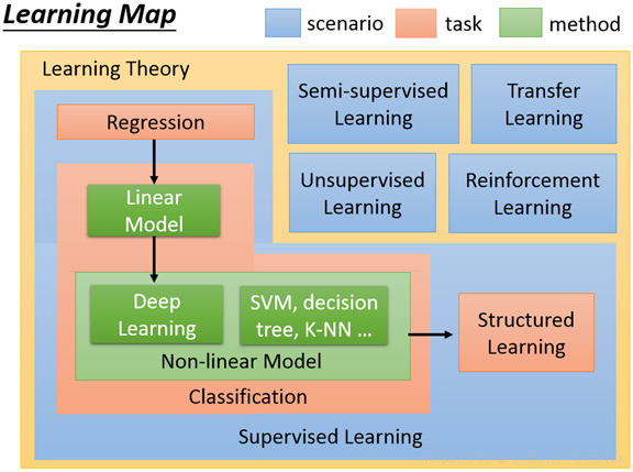 图中蓝色代表不同的学习理论,橙色代表任务,绿色代表方法。