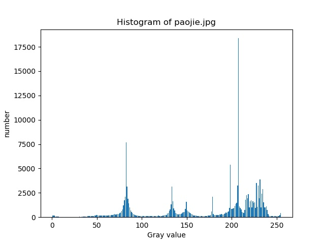 1 import cv2 2 import numpy as np 3 import matplotlib.pyplot as plt 4 5 # Gray scale 6 def BGR2GRAY(img): 7 b = img[:, :, 0].copy() 8 g = img[:, :, 1].copy() 9 r = img[:, :, 2].copy() 10 11 # Gray scale 12 out = 0.2126 * r + 0.7152 * g + 0.0722 * b 13 out = out.astype(np.uint8) 14 15 return out 16 17 # Read image 18 img = cv2.imread("../paojie.jpg").astype(np.float) 19 # BGR2GRAY 20 img = BGR2GRAY(img) 21 # Display histogram 22 # numpy中的ravel() 将多维数组转换为一维数组,不会产生副本 23 plt.hist(img.ravel(), bins=255, rwidth=0.8, range=(0, 255)) 24 plt.xlabel('Gray value') 25 plt.ylabel('number') 26 plt.title(r'Histogram of paojie.jpg') 27 plt.savefig("out.jpg") 28 plt.show()