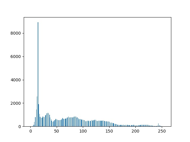 1 import cv2 2 import numpy as np 3 import matplotlib.pyplot as plt 4 5 # histogram normalization 6 def hist_normalization(img, a=0, b=255): 7 # get max and min 8 c = img.min() 9 d = img.max() 10 11 out = img.copy() 12 13 # normalization 14 out = (b-a) / (d - c) * (out - c) + a 15 out[out < a] = a 16 out[out > b] = b 17 out = out.astype(np.uint8) 18 19 return out 20 21 # Read image 22 img = cv2.imread("../head_g_n.jpg",0).astype(np.float) 23 # histogram normalization 24 out = hist_normalization(img) 25 26 # Display histogram 27 plt.hist(out.ravel(), bins=255, rwidth=0.8, range=(0, 255)) 28 plt.savefig("out_his.jpg") 29 plt.show() 30 31 # Save result 32 cv2.imshow("result", out) 33 cv2.imwrite("out.jpg", out) 34 cv2.waitKey(0) 35 cv2.destroyAllWindows()
