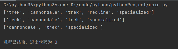 bicycles = ['trek', 'cannondale', 'trek', 'redline', 'specialized']