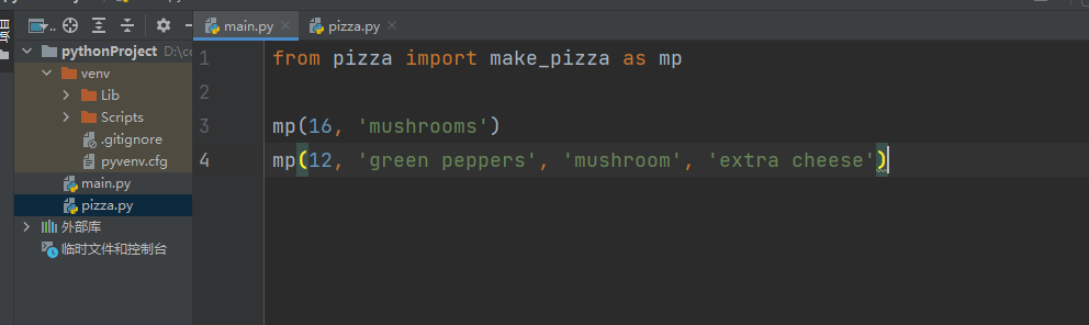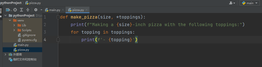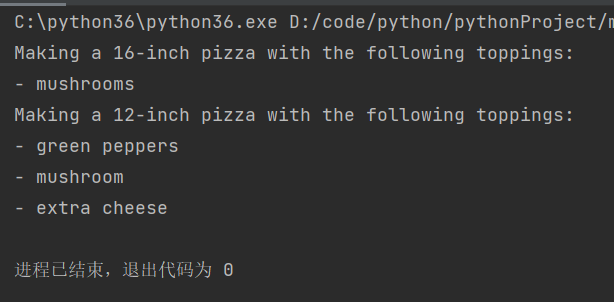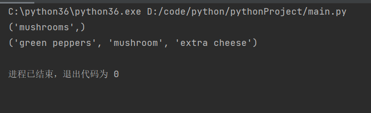 形参名 *toppings中的星号让python创建一个名为toppings的元组,