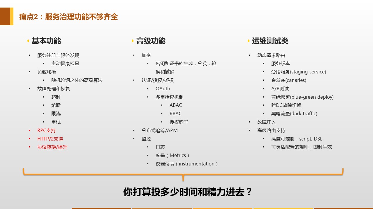 问题的根源在哪里?面临的这些问题,这么多艰巨的挑战,和业务应用,或者说服务本身,有直接关系吗?答案是:没有。这些问题都属于服务间通讯的范围,和应用本身的实现逻辑无关。