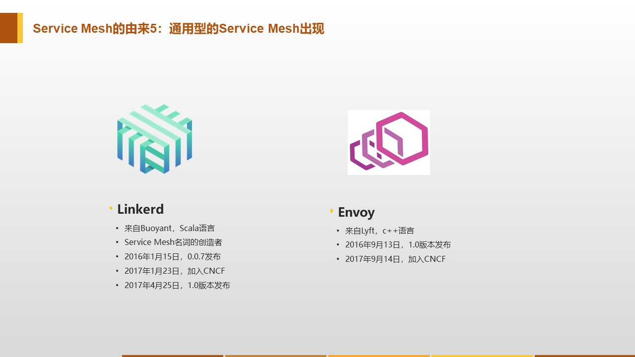 2016年1月,离开Twitter的基础设施工程师William Morgan和Oliver Gould,在github上发布了Linkerd 0.0.7版本,业界第一个Service Mesh项目就此诞生。Linkerd基于Twitter的Finagle开源项目,大量重用了Finagle的类库,但是实现了通用性,成为了业界第一个Service Mesh项目。而Envoy是第二个Service Mesh项目,两者的开发时间差不多,在2017年都相继成为CNCF项目。