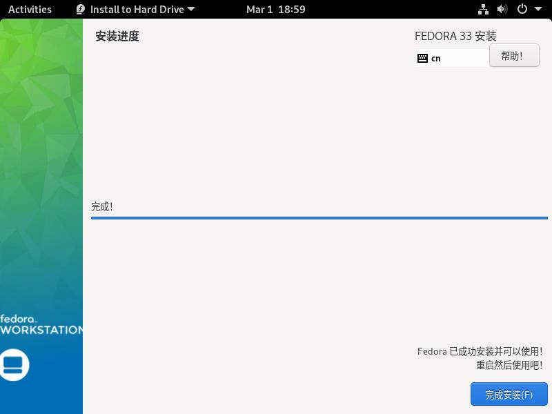 15,设置完成后,点击“全部搞定”,开始正式使用fedora-ws-live 33系统