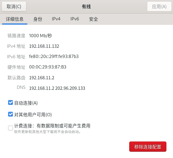 详细信息:显示网络连接信息的界面,“自动连接”与“对其他用户可用”全部勾选