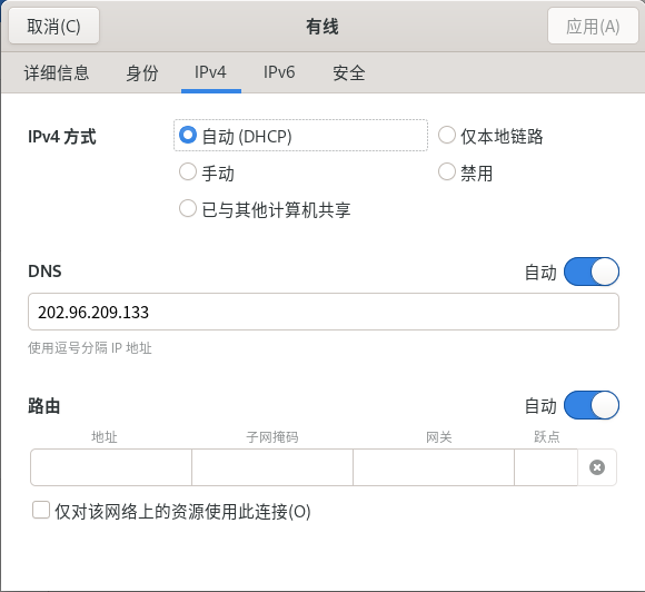 选择“自动(DHCP)”IPV4方式,DNS为“自动”,路由为“自动”