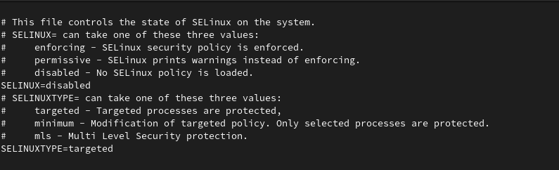 编辑SELinux配置文件/etc/selinux/config,设置SELINUX=disabled,保存退出
