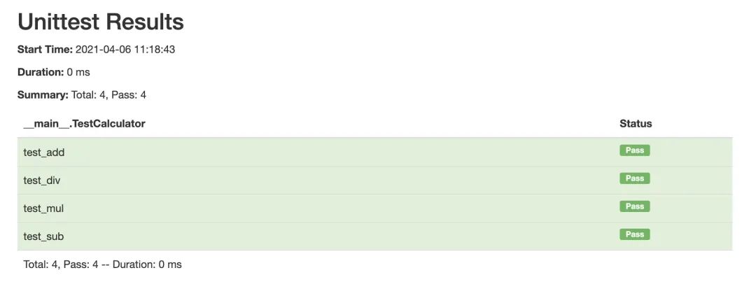 test_add_0 (__main__.TestCalculator) ... ok test_add_1 (__main__.TestCalculator) ... ok test_add_2 (__main__.TestCalculator) ... ok ---------------------------------------------------------------------- Ran 3 tests in 0.000s OK