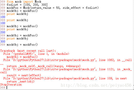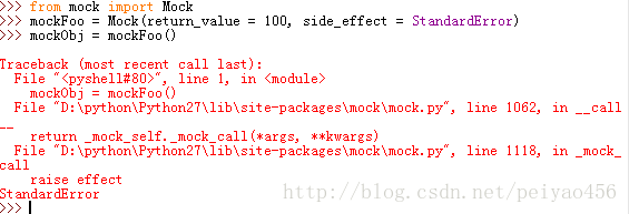从上边的例子可以看出,当side_effecr被设置的时候,return_value就被屏蔽了,不起作用了,上边side_effect被设置的是一个异常。