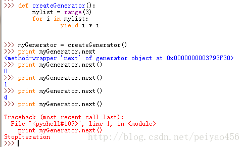 看下边的例子:通过下边的函数创建出了一个生成器之后,每次执行next操作,都会返回一个值,当返回完的时候,就会抛出异常。
